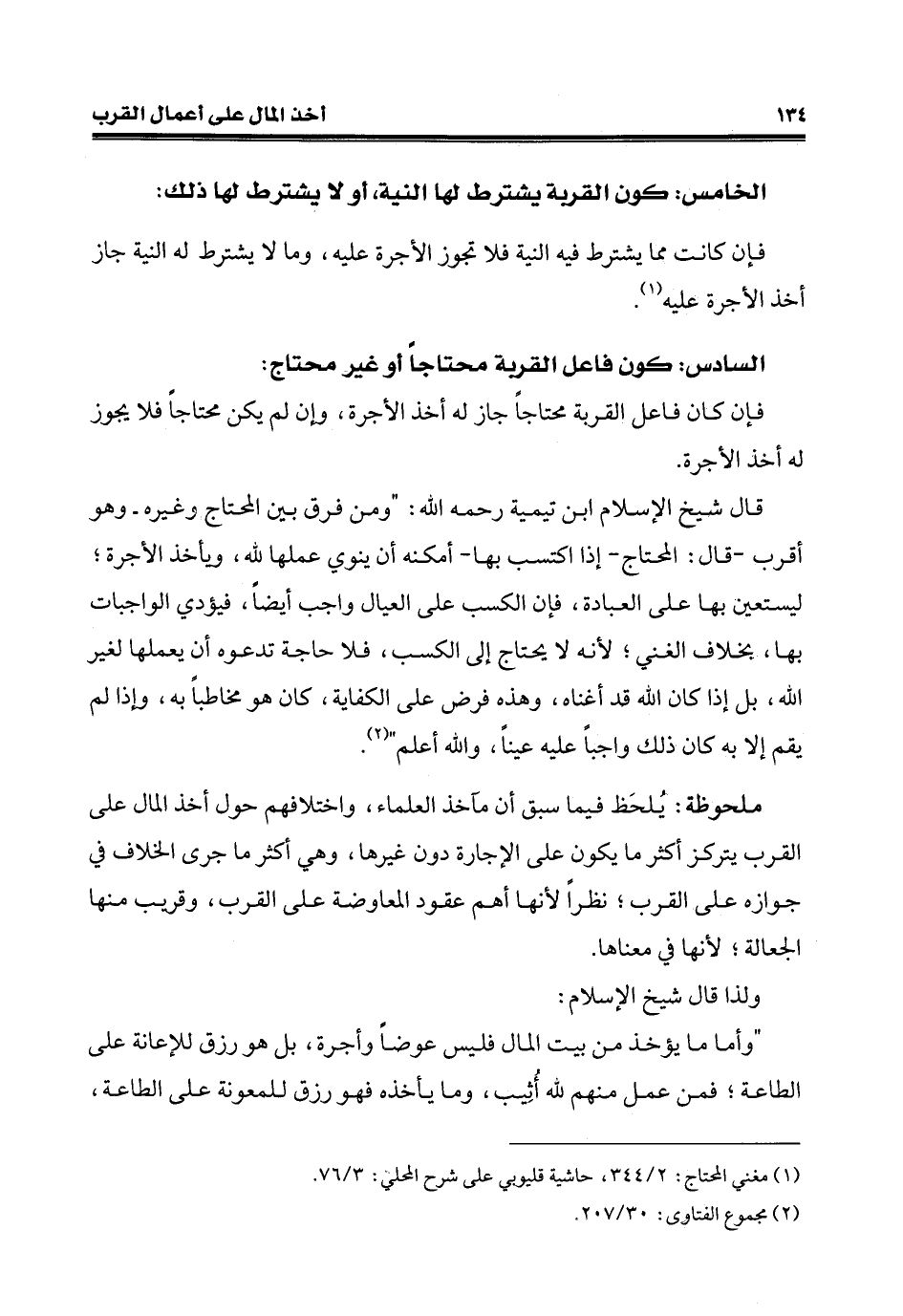 قال شيخ الإسلام ابن تيمية رحمه الله: "ومن فرق بين المحتاج وغيره - وهو أقرب - قال: المحتاج - إذا اكتسب بها - أمكنه أن ينوي عملها لله، ويأخذ الأجرة؛ ليستعين بها على العبادة، فإن الكسب على العيال واجب أيضًا، فيؤدِّي الواجبات بها، بخلاف الغني؛ لأنّه لا يحتاج إلى الكسب، فلا حاجة تدعوه أن يعملها لغير الله، بل إذا كان الله قد أغناه، وهذه فرض على الكفاية، كان هو مخاطبًا به، وإذا لم يقم إِلَّا به كان ذلك واجبًا عليه عينًا، والله أعلم" (¬2).