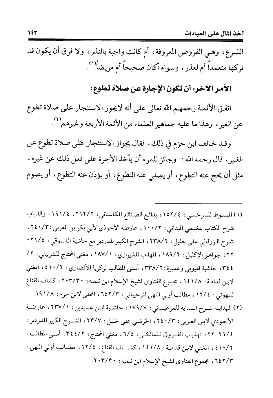 (¬1) المبسوط للسرخسي: 4/ 152، بدائع الصنائع للكاساني: 2/ 212، 4/ 191، واللباب شرح الكتاب للغنيمي الميداني: 2/ 100، عارضة الأحوذي لأبي بكر بن العربي: 3/ 240، شرح الزرقاني على خليل: 2/ 238، الشرح الكبير للدردير مع حاشية الدسوقي: 4/ 21 - 22، جواهر الإكليل: 2/ 189، المهذب للشيرازي: 1/ 187، مغني المحتاج للشربيني: 2/ 344، حاشية قليوبي وعميرة: 2/ 338، أسنى المطالب لزكريا الأنصاري: 2/ 410، المغني لابن قدامة: 8/ 141، مجموع الفتاوى لشيخ الإسلام ابن تيمية: 30/ 203، كشاف القناع للبهوتي: 4/ 12، مطالب أولي النهى للرحيباني: 3/ 642، المحلى لابن حزم: 8/ 191.