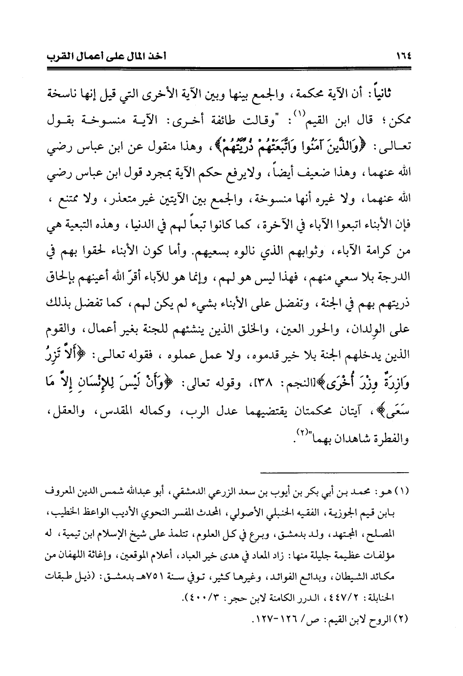 ثانيًا: أن الآية محكمة، والجمع بينها وبين الآية الأخرى الّتي قيل إنها ناسخة ممكن؛ قال ابن القيم (¬1): "وقالت طائفة أخرى: الآية منسوخة بقول تعالى: {وَالَّذِينَ آمَنُوا وَاتَّبَعَتْهُمْ ذُرِّيَّتُهُمْ}، وهذا منقول عن ابن عبّاس رضي الله عنهما، وهذا ضعيف أيضًا، ولايرفع حكم الآية بمجرد قول ابن عبّاس رضي الله عنهما، ولا غيره أنّها منسوخة، والجمع بين الآيتين غير متعذر، ولا ممتنع، فإن الأبناء اتبعوا الآباء في الآخرة، كما كانوا تبعًا لهم في الدنيا، وهذه التبعية هي من كرامة الآباء، وثوابهم الّذي نالوه بسعيهم. وأمّا كون الأبناء لحقوا بهم في الدرجة بلا سعي منهم، فهذا ليس هو لهم، وإنّما هو للآباء أقرّ الله أعينهم بإلحاق ذريتهم بهم في الجنَّة، وتفضل على الأبناء بشيء لم يكن لهم، كما تفضل بذلك على الوِلدان، والحور العين، والخلق الذين ينشئهم للجنة بغير أعمال، والقوم الذين يدخلهم الجنَّة بلا خير قدموه، ولا عمل عملوه، فقوله تعالى: {أَلَّا تَزِرُ وَازِرَةٌ وِزْرَ أُخْرَى} [النجم: 38]، وقوله تعالى؛ {وَأَنْ لَيْسَ لِلْإِنْسَانِ إِلَّا مَا سَعَى}، آيتان محكمتان يقتضيهما عدل الرب، وكماله القدس، والعقل، والفطرة شاهدان بهما" (¬2).