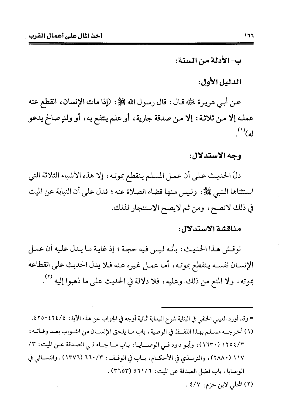 نوقش هذا الحديث: بأنّه ليس فيه حجة. إذ غاية ما يدلُّ عليه أن عمل الإنسان نفسه ينقطع بموته، أمّا عمل غيره عنه فلا يدلُّ الحديث على انقطاعه بموته، ولا المنع من ذلك. وعليه، فلا دلالة في الحديث على ما ذهبوا إليه (¬2).