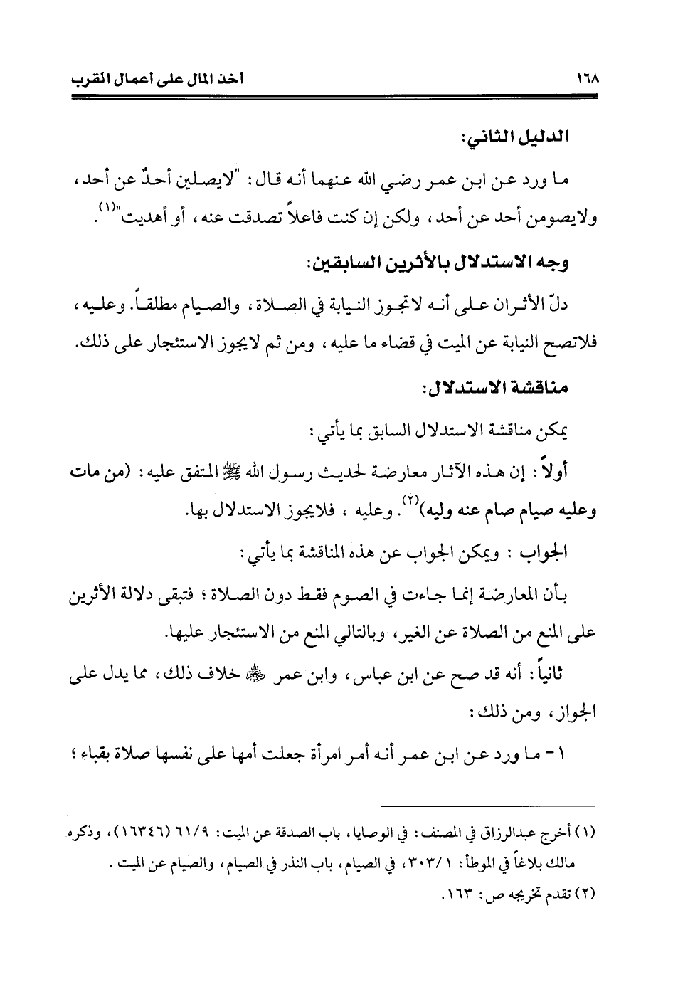 بأن المعارضة إنّما جاءت في الصوم فقط دون الصّلاة؛ فتبقى دلالة الأثرين على النع من الصّلاة عن الغير، وبالتالي المنع من الاستئجار عليها.