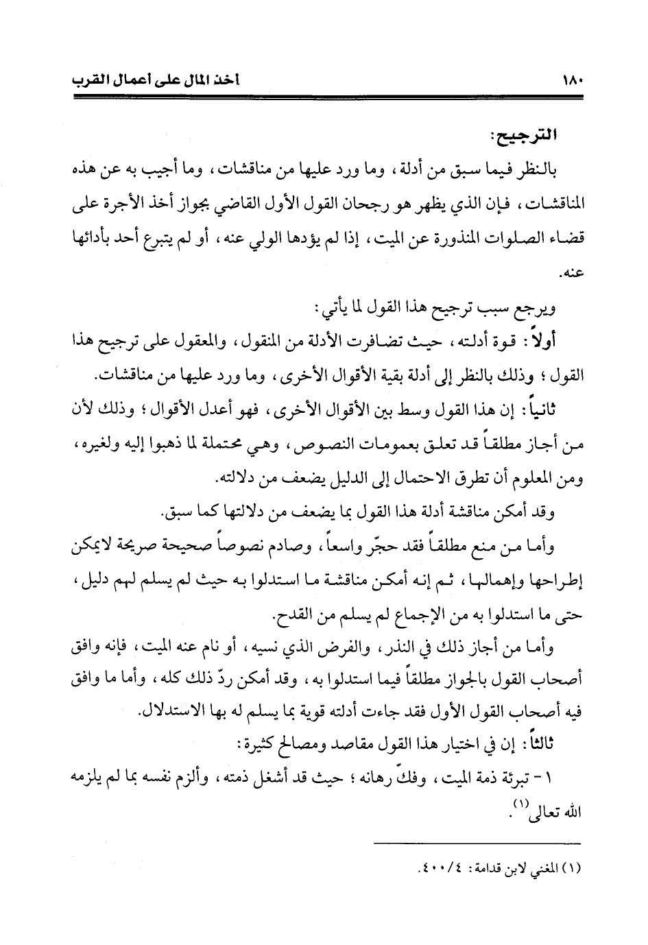 بالنظر فيما سبق من أدلة، وما ورد عليها من مناقشات، وما أجيب به عن هذه المناقشات، فإن الّذي يظهر هو رجحان القول الأوّل القاضي بجواز أخذ الأجرة على قضاء الصلوات المنذورة عن الميِّت، إذا لم يؤدها الولي عنه، أو لم يتبرع أحد بأدائها عنه.