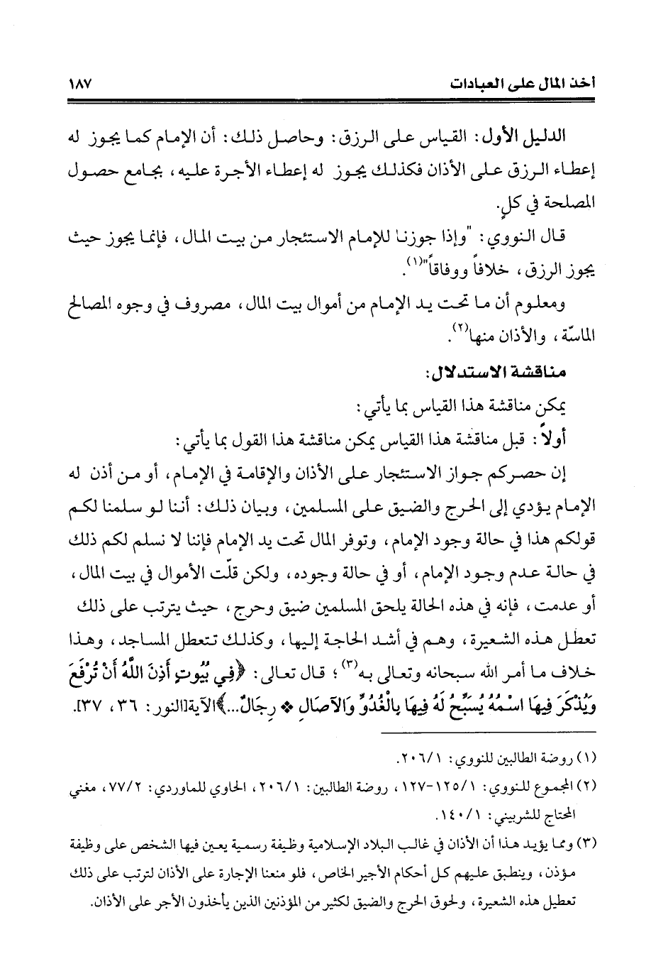 (¬3) ومما يؤيد هذا أن الأذان في غالب البلاد الإسلامية وظيفة رسمية يعين فيها الشخص على وظيفة مؤذن، وينطبق عليهم كلّ أحكام الأجير الخاص، فلو منعنا الإجارة على الأذان لترتب على ذلك تعطيل هذه الشعيرة، ولحوق الحرج والضيق لكثير من المؤذنين الذين يأخذون الأجر على الأذان.