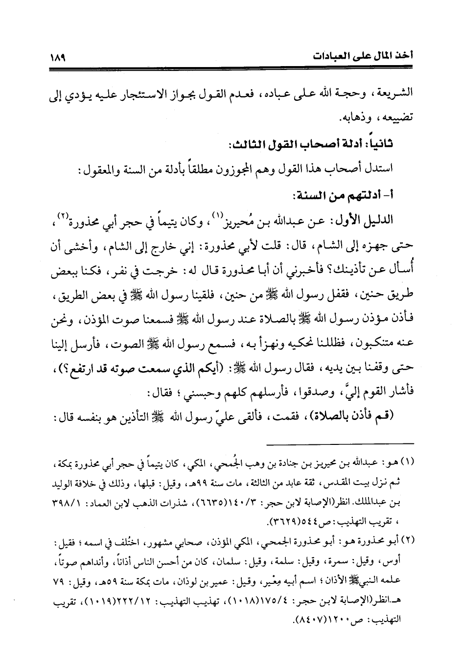 الدّليل الأوّل: عن عبد الله بن مُحيريز (¬1)، وكان يتيمًا في حجر أبي محذورة (¬2)، حتّى جهزه إلى الشّام، قال: قلت لأبي محذورة: إنِّي خارج إلى الشّام، وأخشى أن أُسأل عن تأذينك؟ فأخبرني أن أبا محذورة قال له: خرجت في نفر، فكنا ببعض طريق حنين، فقفل رسول الله - صلّى الله عليه وسلم - من حنين، فلقينا رسول الله - صلّى الله عليه وسلم - في بعض الطريق، فأذن مؤذن رسول الله - صلّى الله عليه وسلم - بالصلاة عند رسول الله - صلّى الله عليه وسلم - فسمعنا صوت المؤذن، ونحن عنه متنكبون، فظللنا نحكيه ونهزأ به، فسمع رسول الله - صلّى الله عليه وسلم - الصوت، فأرسل إلينا حتّى وقفنا بين يديه، فقال رسول الله - صلّى الله عليه وسلم -: (أيكم الّذي سمعت صوته قد ارتفع؟)، فأشار القوم إليَّ، وصدقوا، فأرسلهم كلهم وحبسني؛ فقال: