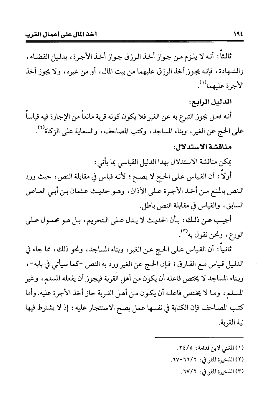 ثانيًا: أن القياس على الحجِّ عن الغير، وبناء المساجد، ونحو ذلك، ممّا جاء في الدّليل قياس مع الفارق؛ فإن الحجِّ عن الغير ورد به النص - كما سيأتي في بابه -، وبناء المساجد لا يختص فاعله أن يكون من أهل القربة فيجوز أن يفعله المسلم، وغير المسلم، وما لا يختص فاعله أن يكون من أهل القربة جاز أخذ الأجرة عليه. وأمّا كتب المصاحف فإن الكتابة في نفسها عمل يصح الاستئجار عليه؛ إذ لا يشترط فيها نيّة القربة.