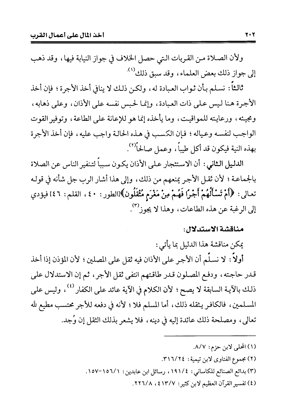 أولَا: لا نسلِّم أن الأجر على الأذان فيه ثقل على المصلّين؛ لأنّ المؤذن إذا أخذ قدر حاجته، ودفع المصلون قدر طاقتهم انتفى ثقل الأجر، ثمّ إنَّ الاستدلال على ذلك بالآية السابقة لا يصح؛ لأنّ الكلام في الآية عائد على الكفار (¬4)، وليس على المسلمين، فالكافر يثقله ذلك، أمّا المسلم فلا؛ لأنّه في دفعه للأجر محتسب مطيع لله تعالى، ومصلحة ذلك عائدة إليه في دينه، فلا يشعر بذلك الثقل إنَّ وُجد.
