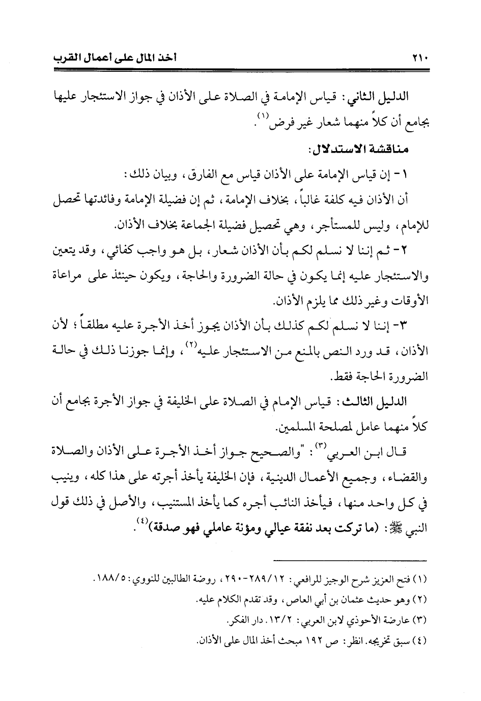 3 - إننا لا نسلم لكم كذلك بأن الأذان يجوز أخذ الأجرة عليه مطلقًا؛ لأنّ الأذان، قد ورد النص بالمنع من الاستئجار عليه (¬2)، وإنّما جوزنا ذلك في حالة الضّرورة الحاجة فقط.