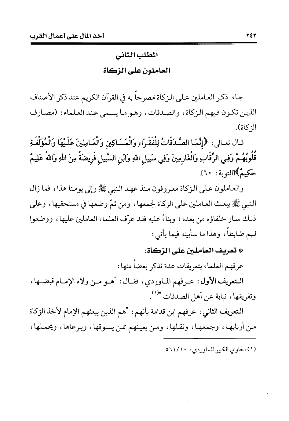 التعريف الأوّل: عرفهم الماوردي، فقال: "هو من ولاه الإمام قبضها، وتفريقها، نيابة عن أهل الصدقات" (¬1).
