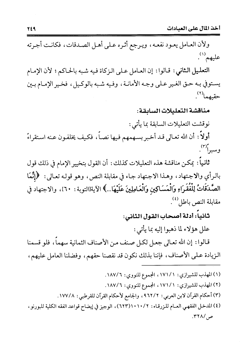 ثانيًا: يمكن مناقشة هذه التعليلات كذلك: أن القول بتخيير الإمام في ذلك قول بالرأي والاجتهاد، وهذا الاجتهاد جاء في مقابلة النص، وهو قوله تعالى: {إِنَّمَا الصَّدَقَاتُ لِلْفُقَرَاءِ وَالْمَسَاكِينِ وَالْعَامِلِينَ عَلَيْهَا ....} الآية [التوبة: 60]، والاجتهاد في مقابلة النص باطل (¬4).
