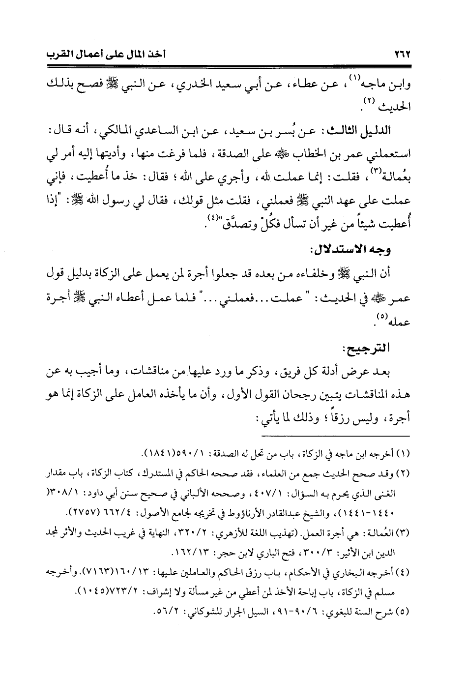 الدّليل الثّالث: عن بُسر بن سعيد، عن ابن الساعدي المالكي، أنّه قال: استعملني عمر بن الخطّاب - رضي الله عنه - على الصَّدقة، فلما فرغت منها، وأديتها إليه أمر لي بعُمالة (¬3)، فقلت: إنّما عملت لله، وأجري على الله؛ فقال: خذ ما أُعطيت، فإني عملت على عهد النّبيّ - صلّى الله عليه وسلم - فعملني، فقلت مثل قولك، فقال لي رسول الله - صلّى الله عليه وسلم -: "إذا أُعطيت شيئًا من غير أن تسأل فكُلْ وتصدَّق" (¬4).