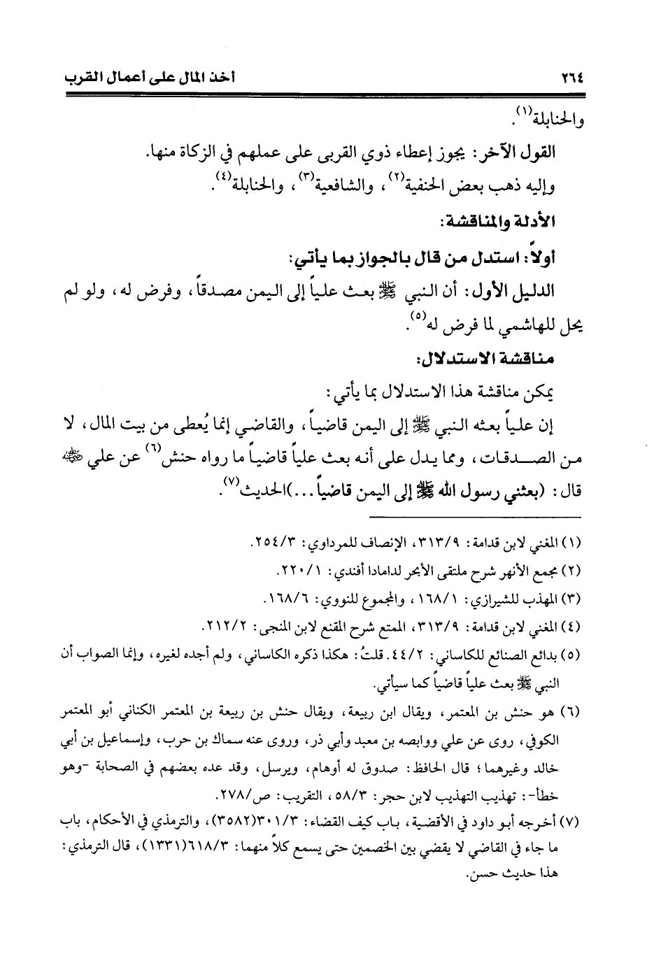 إنَّ عليًا بعثه النّبيّ - صلّى الله عليه وسلم - إلى اليمن قاضيًا، والقاضي إنّما يُعطى من بيت المال، لا من الصدقات، ومما يدلُّ على أنّه بعث عليًا قاضيًا ما رواه حنش (¬6) عن علي - رضي الله عنه - قال: (بعثني رسول الله - صلّى الله عليه وسلم - إلى اليمن قاضيًا ...) الحديث (¬7).
