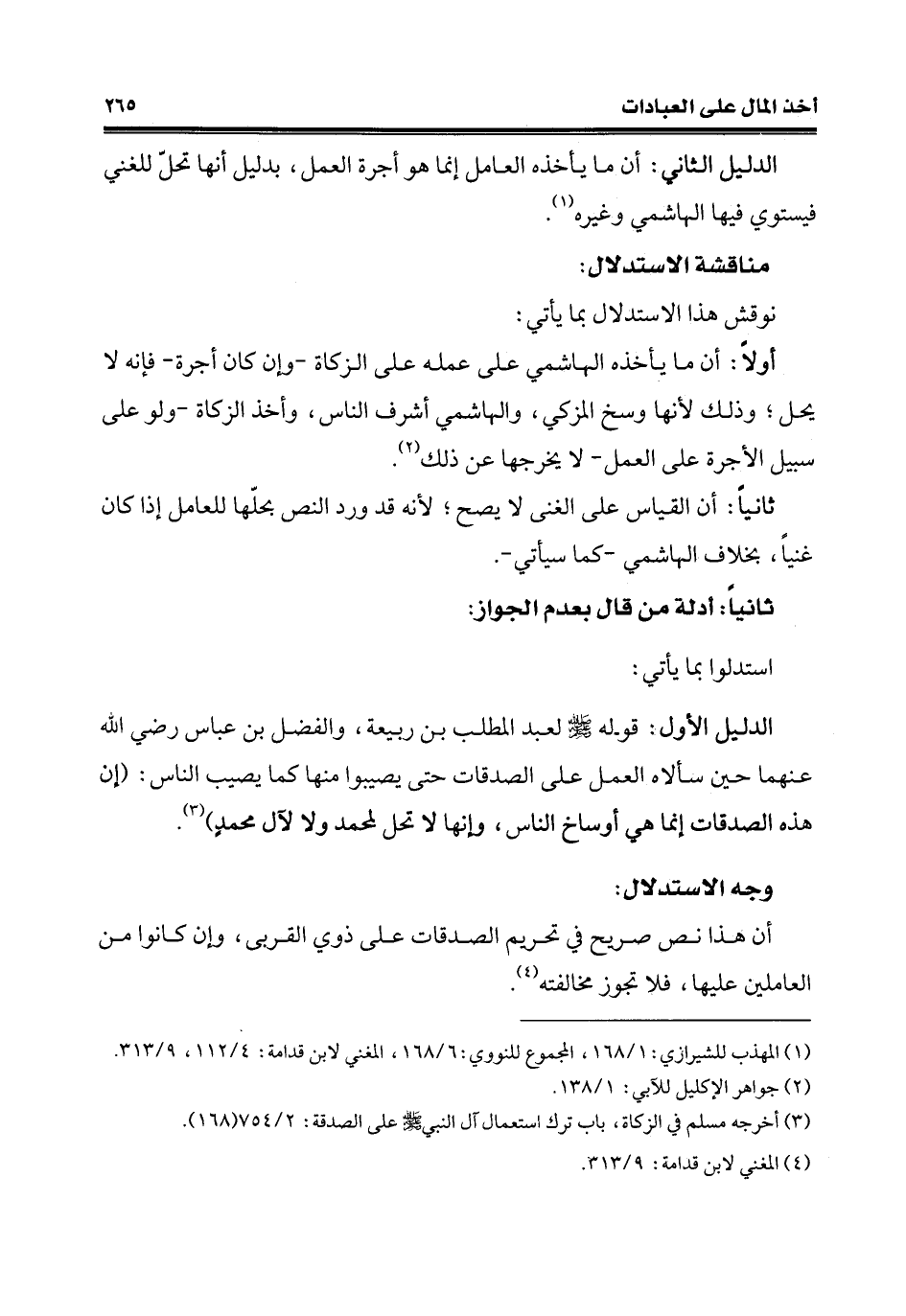الدّليل الأوّل: قوله - صلّى الله عليه وسلم - لعبد المطلب بن ربيعة، والفضل بن عبّاس رضي الله عنهما حين سألاه العمل على الصدقات حتّى يصيبوا منها كما يصيب النَّاس: (إنَّ هذه الصدقات إنّما هي أوساخ النَّاس، وإنها لا تحل لمحمد ولا لآل محمدٍ) (¬3).