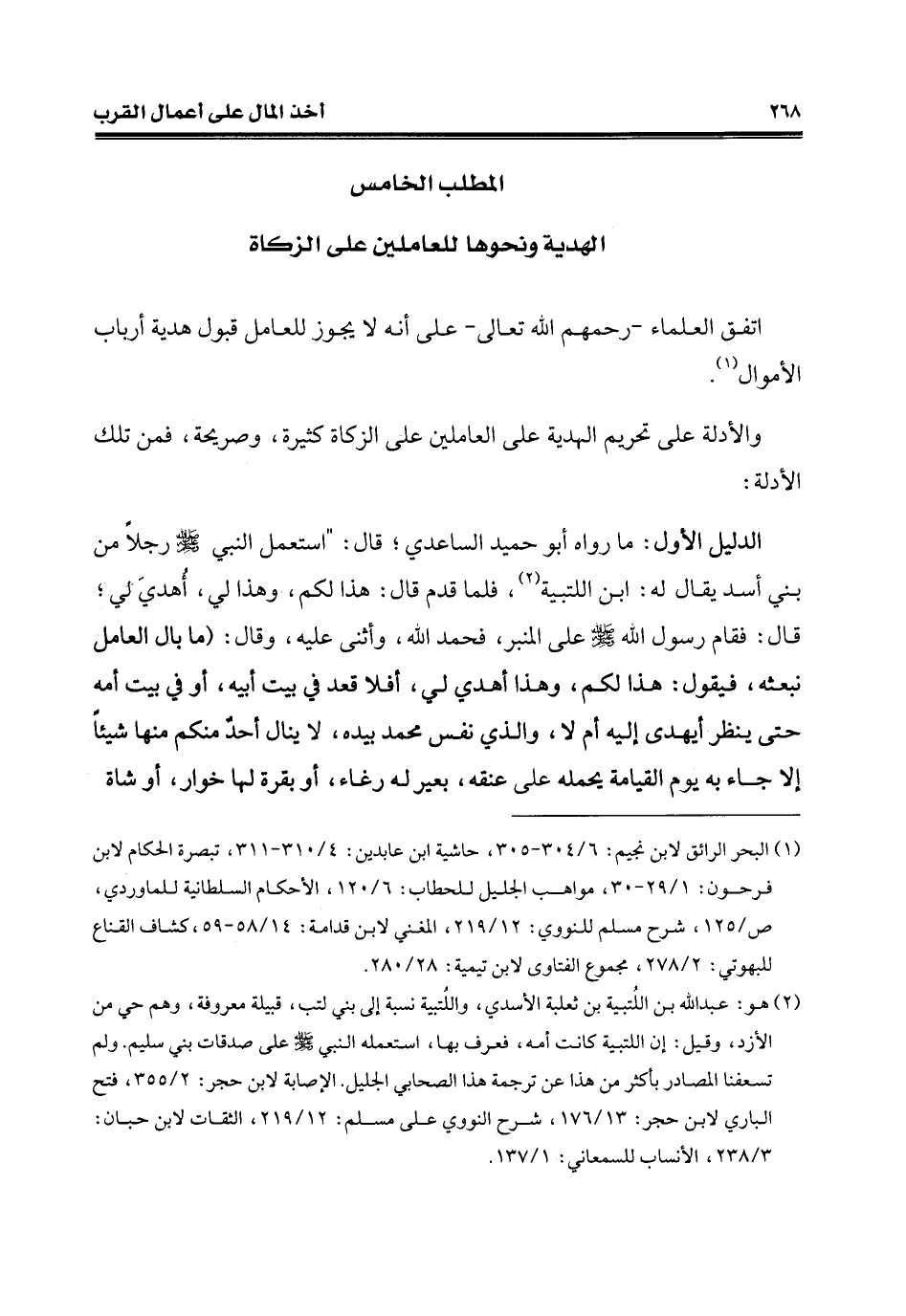 الدّليل الأوّل: ما رواه أبو حميد الساعدي؛ قال: "استعمل النّبيّ - صلّى الله عليه وسلم - رجلًا من بني أسدّ يقال له: ابن اللتبية (¬2)، فلما قدم قال: هذا لكم، وهذا لي، أُهديَ لي؛ قال: فقام رسول الله - صلّى الله عليه وسلم - على المنبر، فحمد الله، وأثنى عليه، وقال: (ما بال العامل نبعثه، فيقول: هذا لكم، وهذا أهدي لي، أفلا قعد في بيت أبيه، أو في بيت أمه حتّى ينظر أيهدى إليه أم لا، والذي نفس محمّد بيده، لا ينال أحدٌ منكم منها شيئًا إِلَّا جاء به يوم القيامة يحمله على عنقه، بعير له رغاء، أو بقرة لها خوار، أو شاة