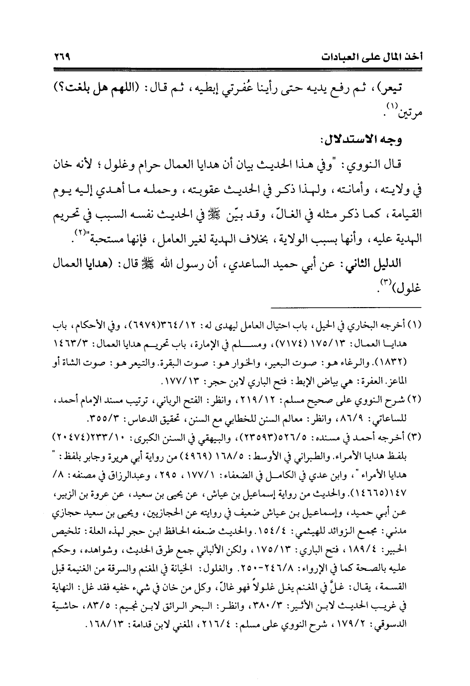 (¬3) أخرجه أحمد في مسنده: 5/ 526 (23593)، والبيهقي في السنن الكبرى: 10/ 233 (20474) بلفظ هدايا الأمراء. والطبراني في الأوسط:5/ 168 (4969) من رواية أبي هريرة وجابر بلفظ: " هدايا الأمراء"، وابن عدي في الكامل في الضعفاء: 1/ 177، 295، وعبد الرزّاق في مصنفه: 8/ 147 (14665). والحديث من رواية إسماعيل بن عياش، عن يحيى بن سعيد، عن عروة بن الزبير، عن أبي حميد، وإسماعيل بن عياش ضعيف في روايته عن الحجازبين، ويحيى بن سعيد حجازي مدني: مجمع الزوائد للهيثمي: 4/ 154. والحديث ضعفه الحافظ ابن حجر لهذه العلّة: تلخيص الحبير: 4/ 189، فتح الباري: 13/ 175، ولكن الألباني جمع طرق الحديث، وشواهده، وحكم عليه بالصحة كما في الإرواء: 8/ 246 - 250. والغلول: الخيانة في المغنم والسّرقة من الغنيمة قبل القسمة، يقال: غلَّ في المغنم يغل غلولًا فهو غالّ، وكل من خان في شيء خفيه فقد غل: النهاية في غريب الحديث لابن الأثير: 3/ 380، وانظر: البحر الرائق لابن نجيم: 5/ 83، حاشية الدسوقي: 2/ 179، شرح النووي على مسلم: 4/ 216، المغني لابن قدامة: 13/ 168.