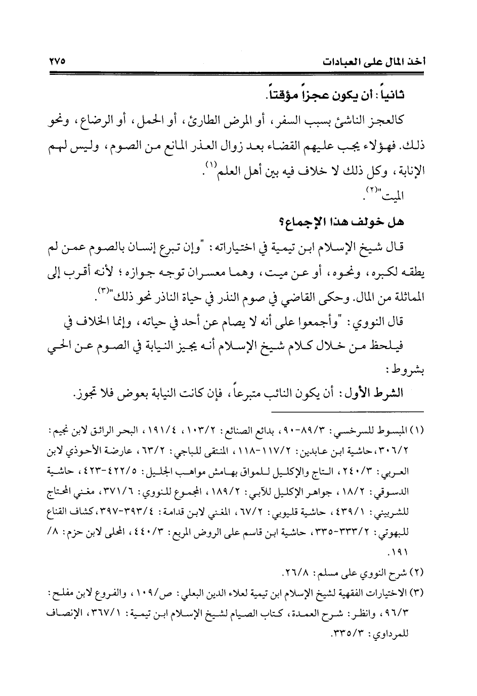 (¬3) الاختيارات الفقهية لشيخ الإسلام ابن تيمية لعلّاء الدِّين البعلي: ص/109، والفروع لابن مفلح: 3/ 96، وانظر: شرح العمدة، كتاب الصِّيام لشيخ الإسلام ابن تيمية: 1/ 367، الإنصاف للمرداوي: 3/ 335.