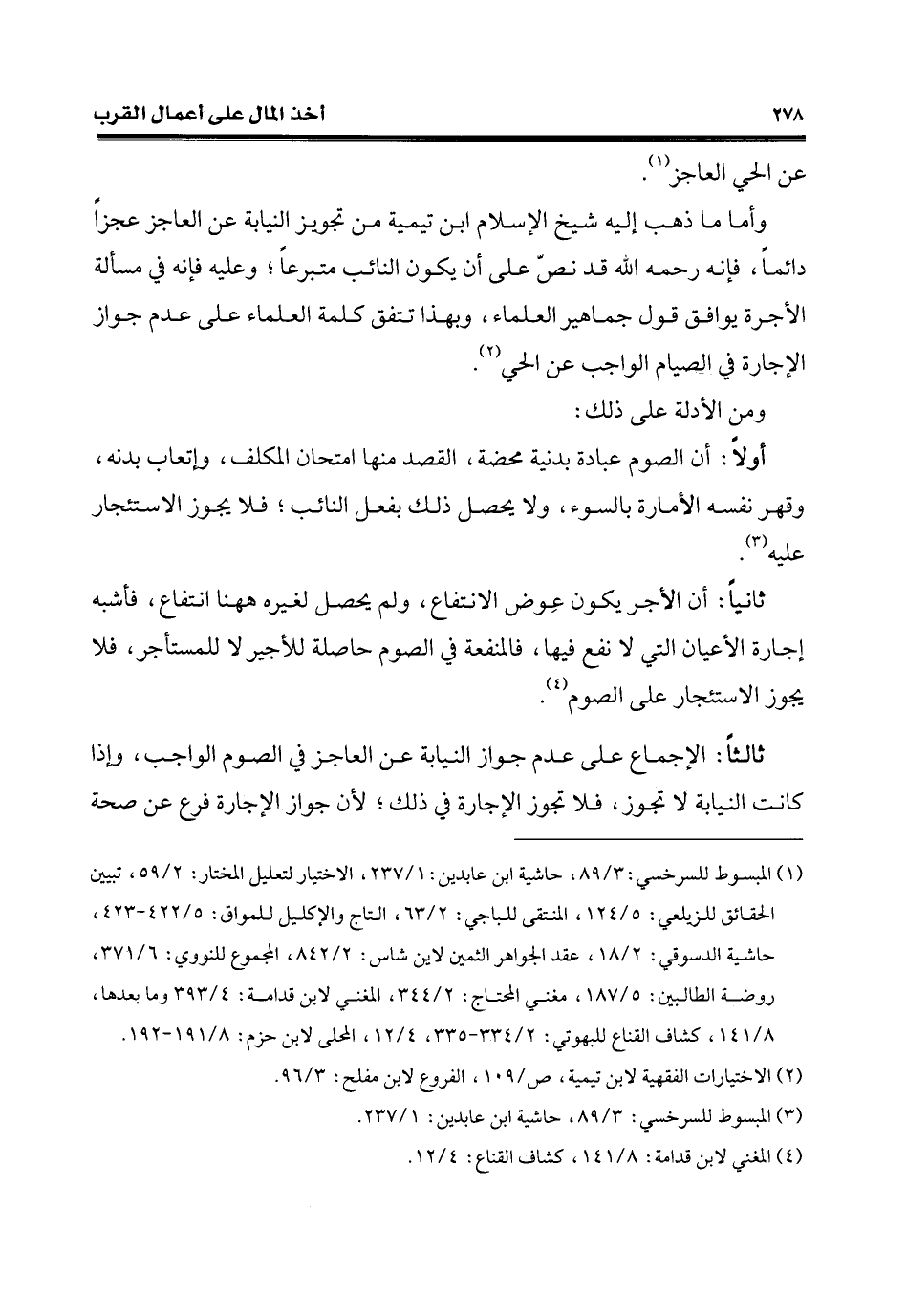 وأمّا ما ذهب إليه شيخ الإسلام ابن تيمية من تجويز النِّيابة عن العاجز عجزًا دائمًا، فإنّه رحمه الله قد نصّ على أن يكون النائب متبرعًا؛ وعليه فإنّه في مسألة الأجرة يوافق قول جماهير العلماء، وبهذا تتفق كلمة العلماء على عدم جواز الإجارة في الصِّيام الواجب عن الحي (¬2).