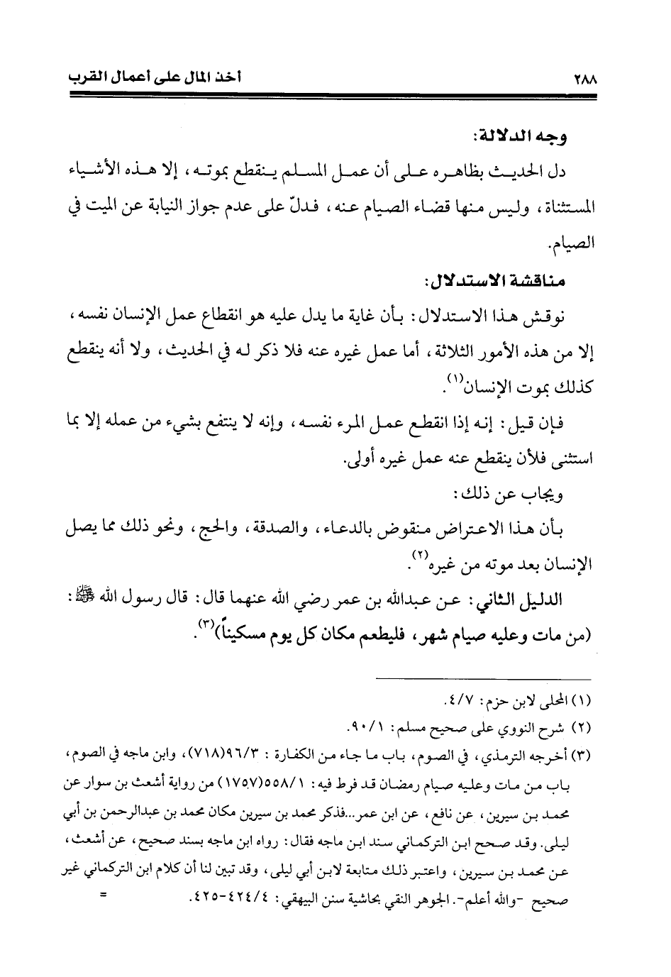 (¬3) أخرجه التّرمذيّ، في الصوم، باب ما جاء من الكفارة: 3/ 96 (718)، وابن ماجه في الصوم، باب من مات وعليه صيام رمضان قد فرط فيه: 1/ 558 (1757) من رواية أشعث بن سوار عن محمّد بن سيرين، عن نافع، عن ابن عمر ... فذكر محمّد بن سيرين مكان محمّد بن عبد الرّحمن بن أبي ليلى. وقد صحح ابن التركماني سند ابن ماجه فقال: رواه ابن ماجه بسند صحيح، عن أشعث، عن محمّد بن سيرين، واعتبر ذلك متابعة لابن أبي ليلى، وقد تبين لنا أن كلام ابن التركماني غير صحيح - والله أعلم -. الجوهر النقي بحاشية سنن البيهقي: 4/ 424 - 425. =