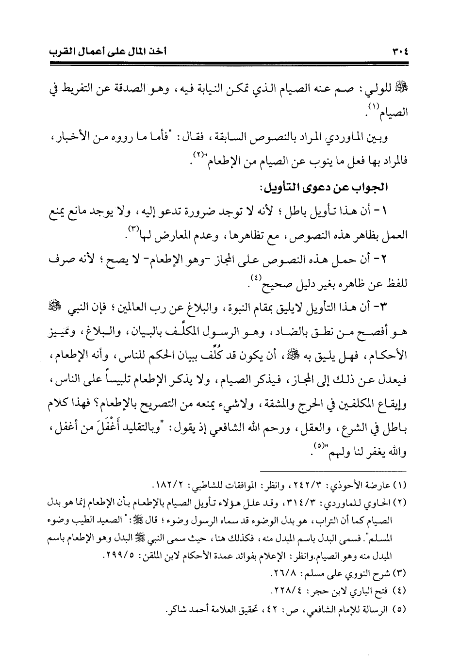 3 - أن هذا التأويل لا يليق بمقام النبوة، والبلاغ عن رب العالمين؛ فإن النبي - صلى الله عليه وسلم - هو أفصح من نطق بالضاد، وهو الرسول المكلَّف بالبيان، والبلاغ، وتمييز الأحكام، فهل يليق - صلى الله عليه وسلم -، أن يكون قد كُلَّف ببيان الحكم للناس، وأنه الإطعام، فيعدل عن ذلك إلى المجاز، فيذكر الصيام، ولا يذكر الإطعام تلبيسًا على الناس، وإيقاع المكلفين في الحرج والمشقة، ولا شيء يمنعه من التصريح بالإطعام؛ فهذا كلام باطل في الشرع، والعقل، ورحم الله الشافعي إذ يقول: "وبالتقليد أَغْفَلَ من أغفل، والله يغفر لنا ولهم" (¬5).