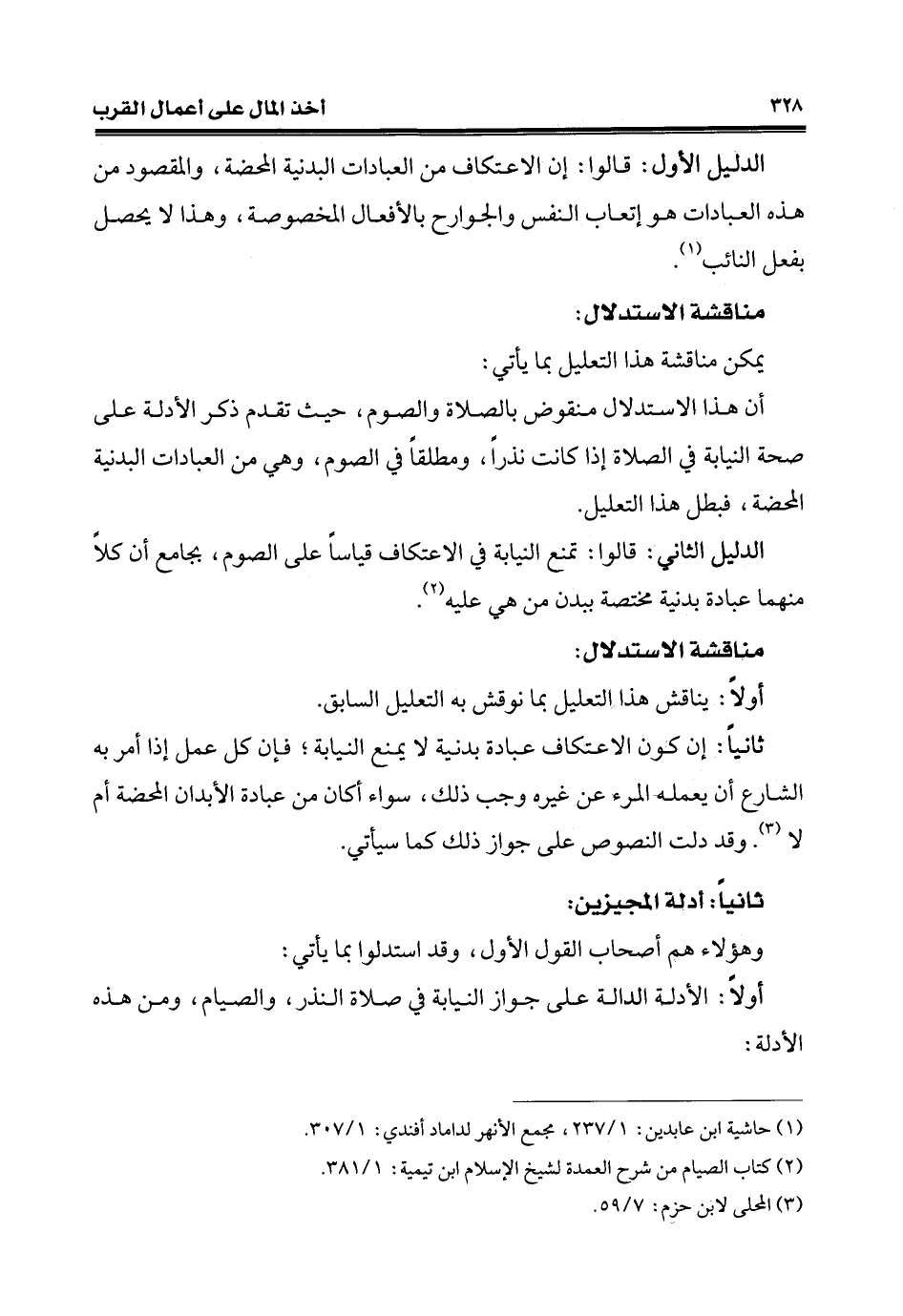 الدليل الأول: قالوا: إن الاعتكاف من العبادات البدنية المحضة، والمقصود من هذه العبادات هو إتعاب النفس والجوارح بالأفعال المخصوصة، وهذا لا يحصل بفعل النائب (¬1).