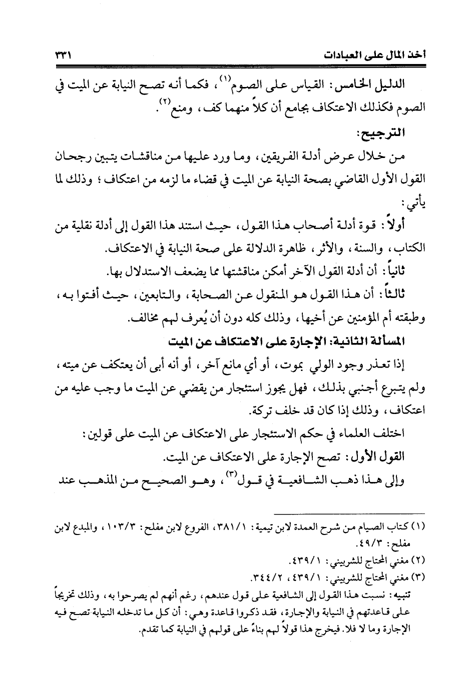 الدليل الخامس: القياس على الصوم (¬1)، فكما أنه تصح النيابة عن الميت في الصوم فكذلك الاعتكاف بجامع أن كلاً منهما كف، ومنع (¬2).