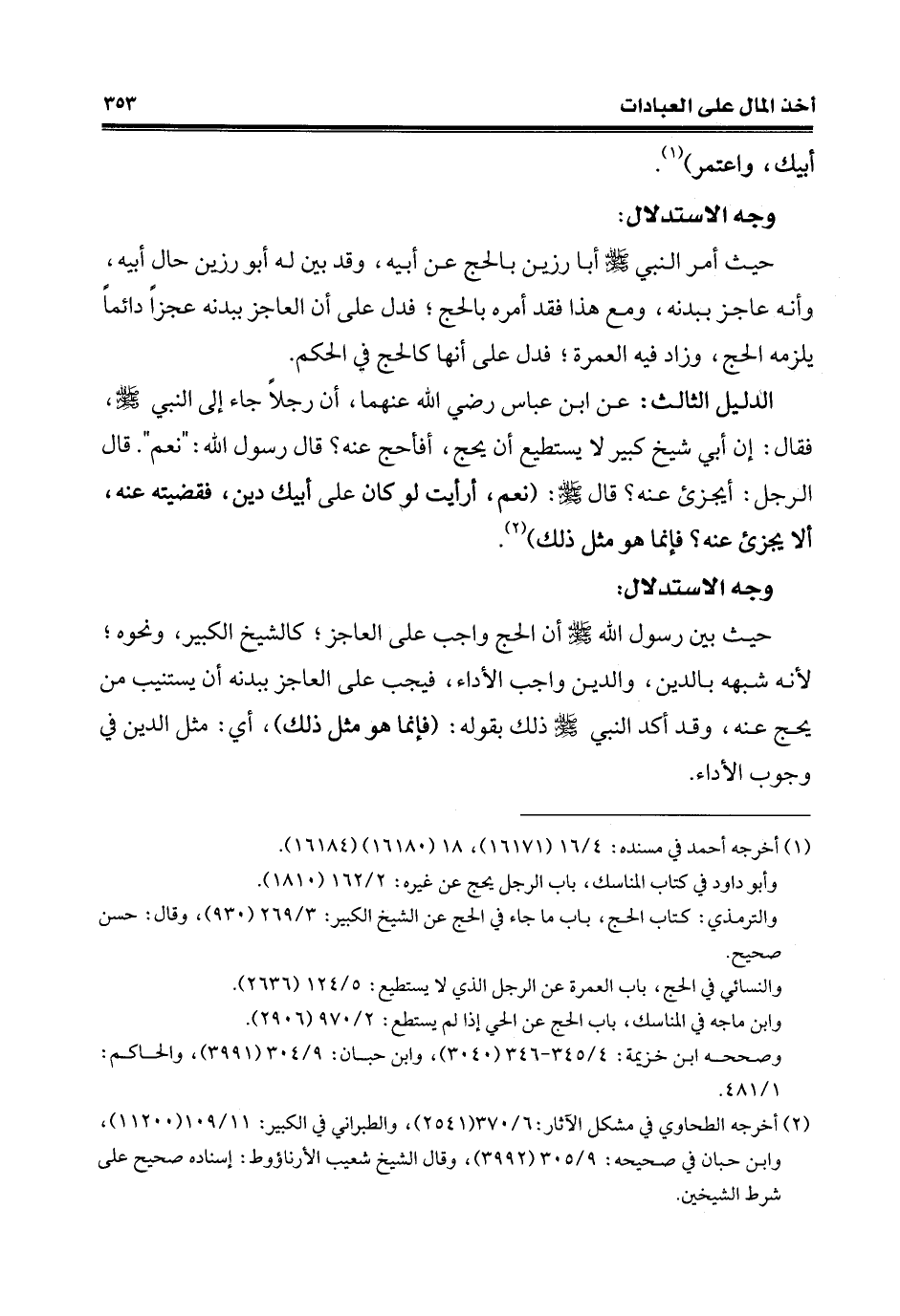 حيث أمر النّبيّ - صلّى الله عليه وسلم - أبا رزين بالحج عن أبيه، وقد بين له أبو رزين حال أبيه، وأنّه عاجز ببدنه، ومع هذا فقد أمره بالحج؛ فدل على أن العاجز ببدنه عجزًا دائمًا يلزمه الحجِّ، وزاد فيه العمرة؛ فدل على أنّها كالحج في الحكم.