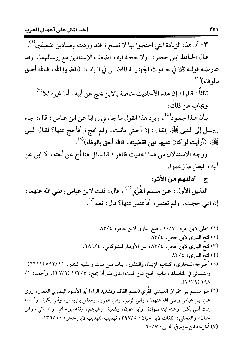الدّليل الأوّل: عن مسلم القُرّي (¬6)، قال: قلت لابن عبّاس رضي الله عنهما: إنَّ أمي حجت، ولم تعتمر، أفاعتمر عنها؟ قال: نعم (¬7).