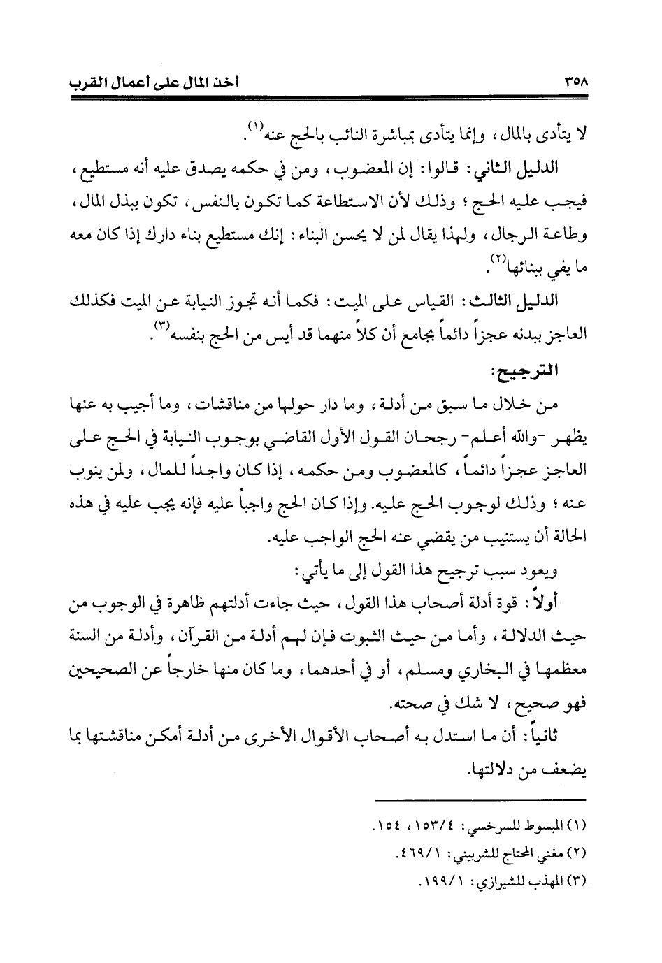 من خلال ما سبق من أدلة، وما دار حولها من مناقشات، وما أجيب به عنها يظهر- والله أعلم- رجحان القول الأوّل القاضي بوجوب النيابة في الحجِّ على العاجز عجزًا دائمًا، كالمعضوب ومن حكمه، إذا كان واجدًا للمال، ولمن ينوب عنه؛ وذلك لوجوب الحجِّ عليه. وإذا كان الحجِّ واجبًا عليه فإنّه يجب عليه في هذه الحالة أن يستنيب من يمَضي عنه الحجِّ الواجب عليه.