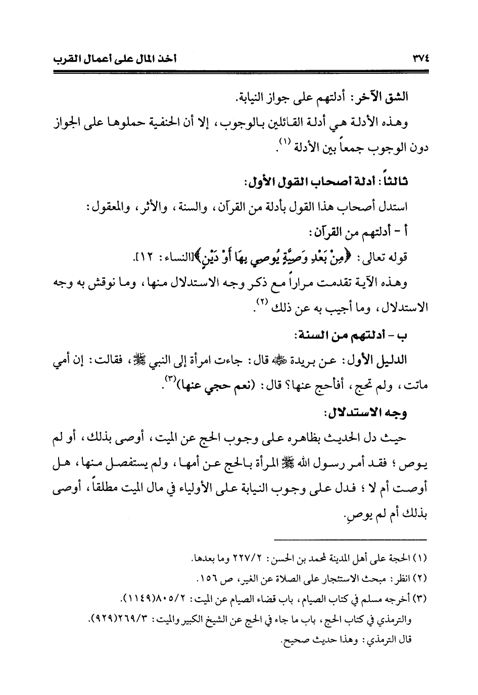الدّليل الأوّل: عن بريدة - رضي الله عنه - قال: جاءت امرأة إلى النّبيّ - صلّى الله عليه وسلم -، فقالت: إنَّ أمي ماتت، ولم تحج، أفاحج عنها؟ قال: (نعم حجي عنها) (¬3).