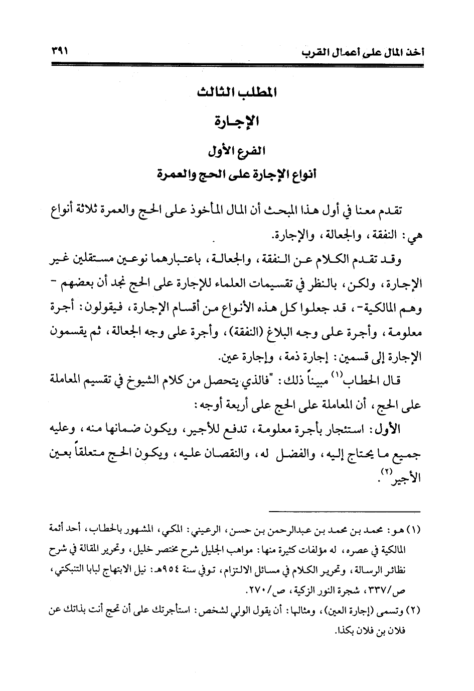(¬1) هو: محمّد بن محمّد بن عبد الرّحمن بن حسن، الرعيني: المكي، المشهور بالحطاب، أحد أئمة المالكية في عصره، له مؤلفات كثيرة منها: مواهب الجليل شرح مختصر خليل، وتحرير المقالة في شرح نظائر الرسالة، وتحرير الكلام في مسائل الالتزام، توفي سنة 954 هـ: نيل الابتهاج لبابا التنبكتي، ص/337، شجرة النور التركية، ص / 270.