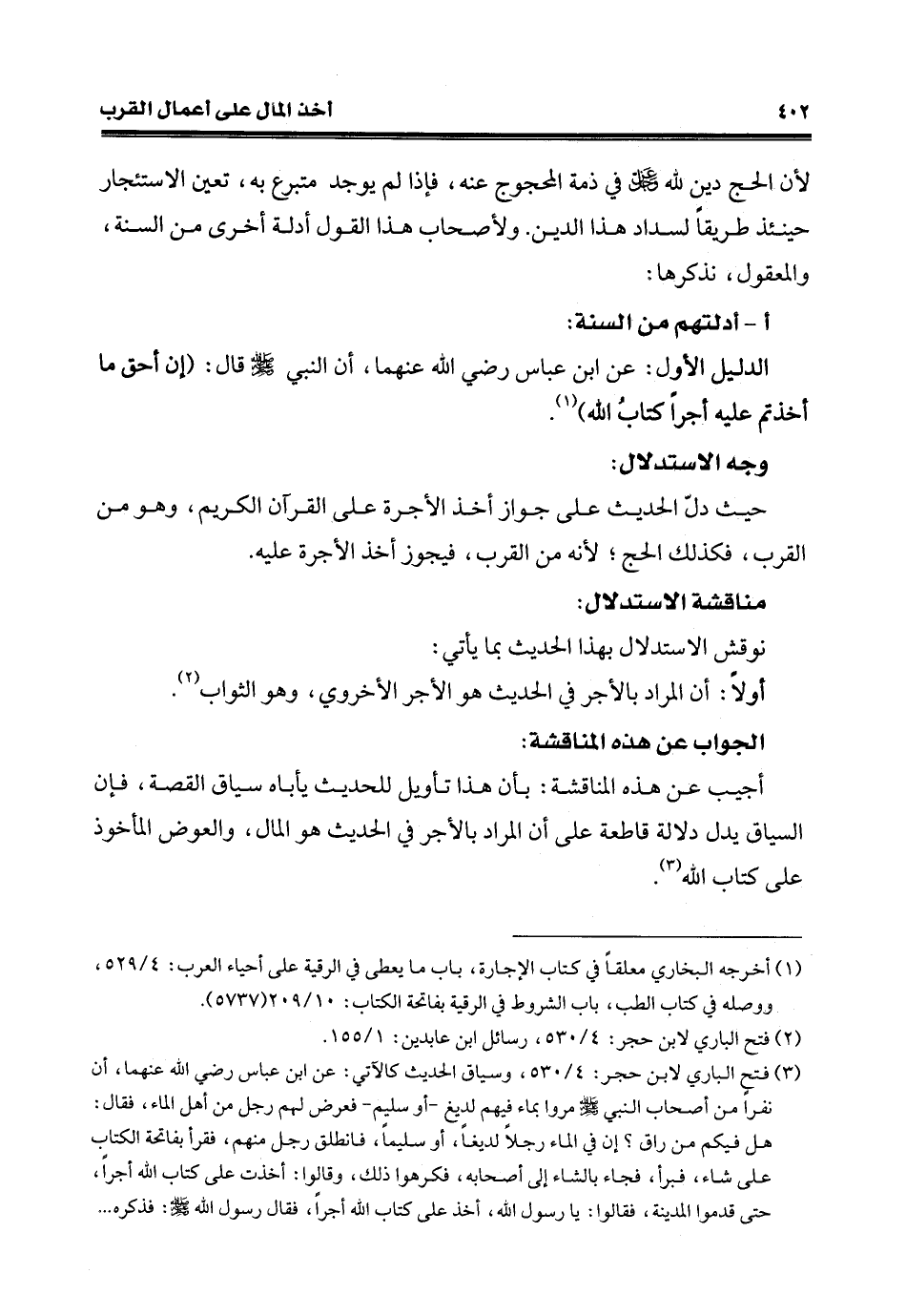 أجيب عن هذه المناقشة: بأن هذا تأويل للحديث يأباه سياق القصة، فإن السياق يدلُّ دلالة قاطعة على أن المراد بالأجر في الحديث هو المال، والعوض المأخوذ على كتاب الله (¬3).