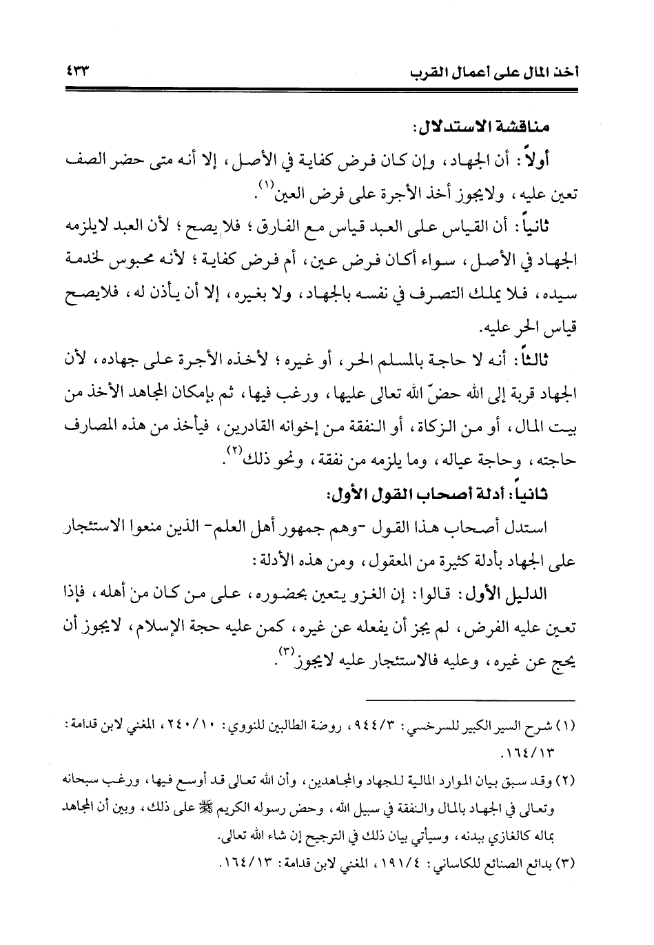 ثالثًا: أنّه لا حاجة بالمسلم الحر، أو غيره؛ لأخذه الأجرة على جهاده، لأنّ الجهاد قربة إلى الله حضّ الله تعالى عليها، ورغب فيها، ثمّ بإمكان المجاهد الأخذ من بيت المال، أو من الزَّكاة، أو النفقة من إخوانه القادرين، فيأخذ من هذه المصارف حاجته، وحاجة عياله، وما يلزمه من نفقة، ونحو ذلك (¬2).