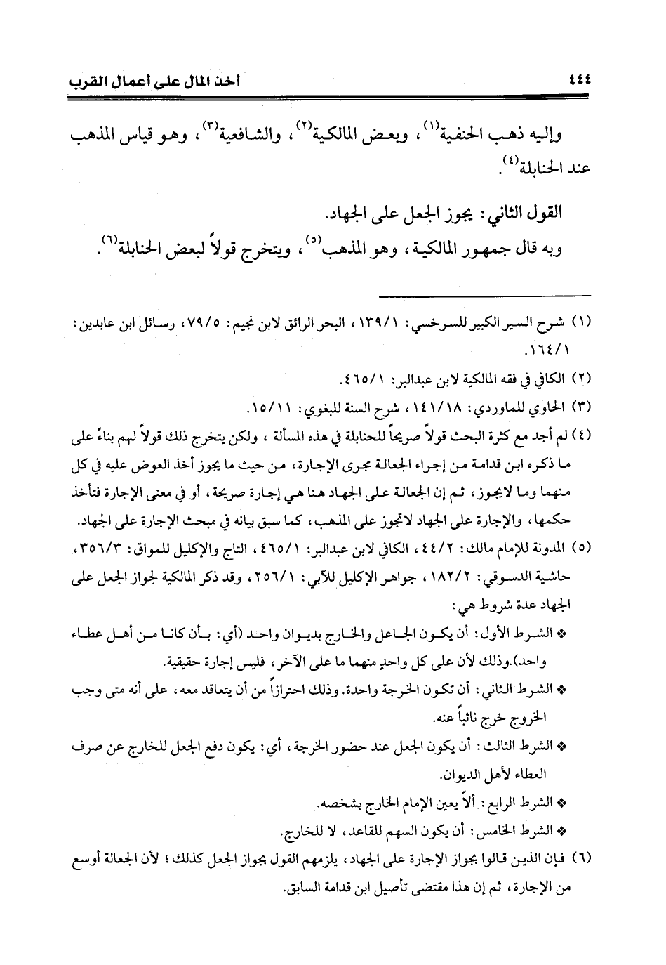 (¬6) فإن الذين قالوا بجواز الإجارة على الجهاد، يلزمهم القول بجواز الجعل كذلك؛ لأنّ الجعالة أوسع من الإجارة، ثمّ إنَّ هذا مقتضى تأصيل ابن قدامة السابق.