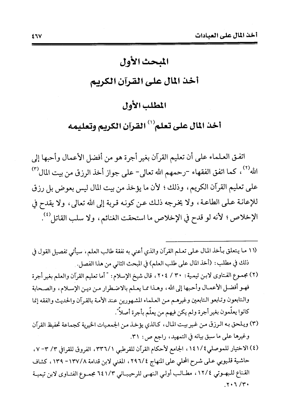 (¬1) ما يتعلّق بأخذ المال على تعلم القرآن والذي أعني به نفقة طالب العلم، سيأتي تفصيل القول في ذلك في مطلب: (أخذ المال على طلب العلم) في المبحث الثّاني من هذا الفصل.