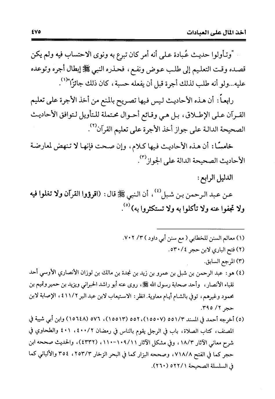 رابعًا: أن هذه الأحاديث ليس فيها تصريح بالمنع من أخذ الأجرة على تعليم القرآن على الإطلاق، بل هي وقائع أحوال محتملة للتأويل لتوافق الأحاديث الصحيحة الدالة على جواز أخذ الأجرة على تعليم القرآن (¬2).