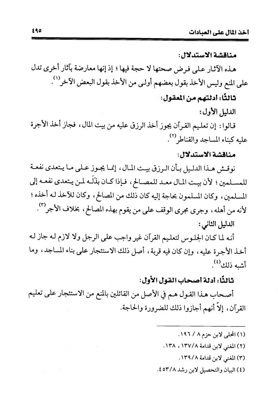 نوقش هذا الدّليل بأن الرزق بيت المال، إنّما يجوز على ما يتعدى نفعة للمسلمين؛ لأنّ بيت المال معد للمصالح، فإذا كان بذَلَه لمن يتعدى نفعه إلى المسلمين، وكان المسلمون بحاجة إليه كان ذلك من المصالح، وكان للآخذ له أخذه؛ لأنّه من أهله، وجرى مجرى الوقف على من يقوم بهذه المصالح، بخلاف الأجر (¬3).
