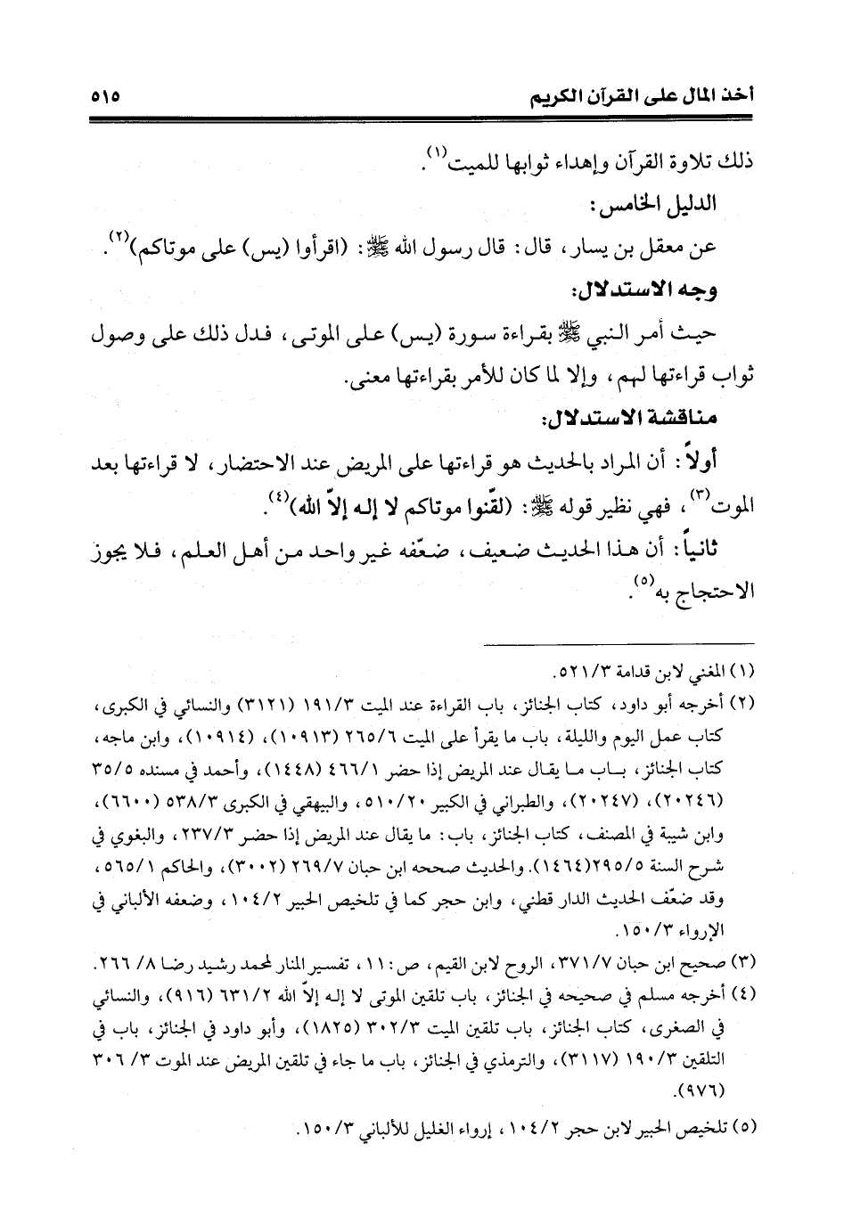 (¬2) أخرجه أبو داود، كتاب الجنائز، باب القراءة عند الميِّت 3/ 191 (3121) والنسائي في الكبرى، كتاب عمل اليوم واللّيلة، باب ما يقرأ على الميِّت 6/ 265 (10913)، (10914)، وابن ماجه، كتاب الجنائز، باب ما يقال عند المريض إذا حضر 1/ 466 (1448)، وأحمد في مسنده 5/ 35 (20246)، (20247)، والطبراني في الكبير 20/ 510، والبيهقي في الكبرى 3/ 538 (6600)، وابن شيبة في المصنِّف، كتاب الجنائز، باب: ما يقال عند المريض إذا حضر 3/ 237، والبغوي في شرح السُّنَّة 5/ 295 (1464). والحديث صححه ابن حبّان 7/ 269 (3002)، والحاكم 1/ 565، وقد ضعّف الحديث الدَّارقطني، وابن حجر كما في تلخيص الحبير 2/ 104، وضعفه الألباني في الإرواء 3/ 150.