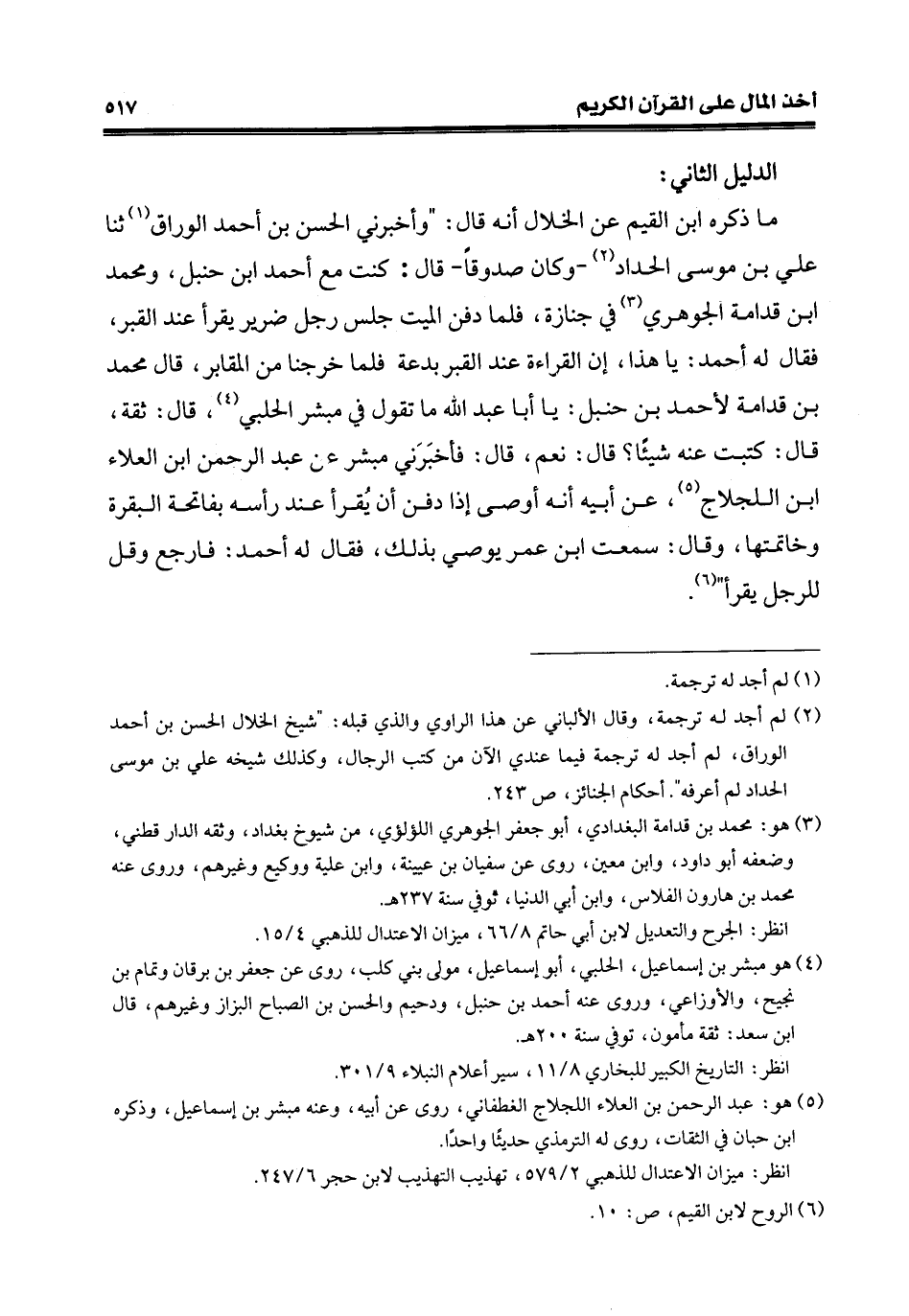 ما ذكره ابن القيم عن الخلال أنّه قال: "وأخبرني الحسن بن أحمد الورَّاق (¬1) ثنا علي بن موسى الحداد (¬2) - وكان صدوقًا- قال: كنت مع أحمد ابن حنبل، ومحمد ابن قدامة الجوهري (¬3) في جنازة، فلما دفن الميِّت جلس رجل ضرير يقرأ عند القبر، فقال له أحمد: يا هذا، إنَّ القراءة عند القبر بدعة فلما خرجنا من المقابر، قال محمّد بن قدامة لأحمد بن حنبل: يا أبا عبد الله ما تقول في مبشر الحلبي (¬4)، قال: ثقة، قال: كتبت عنه شيئًا؟ قال: نعم، قال: فأخبَرَني مبشر عن عبد الرّحمن ابن العلّاء ابن اللجلاج (¬5)، عن أبيه أنّه أوصى إذا دفن أن يُقرأ عند رأسه بفاتحة البقرة وخاتمتها، وقال: سمعت ابن عمر يوصي بذلك، فقال له أحمد: فارجع وقل للرجل يقرأ" (¬6).