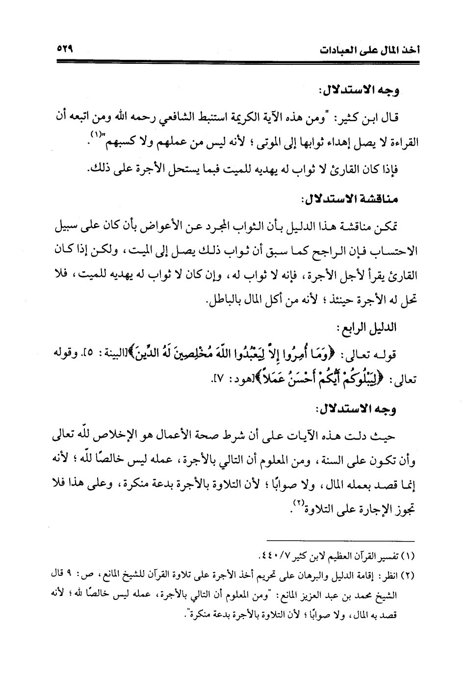 (¬2) انظر: إقامة الدّليل والبرهان على تحريم أخذ الأجرة على تلاوة القرآن للشيخ المانع، ص: 9 قال الشّيخ محمّد بن عبد العزيز المانع: "ومن المعلوم أن التالي بالأجرة، عمله ليس خالصًا لله؛ لأنّه قصد به المال، ولا صوابًا؛ لأنّ التلاوة بالأجرة بدعة منكرة".
