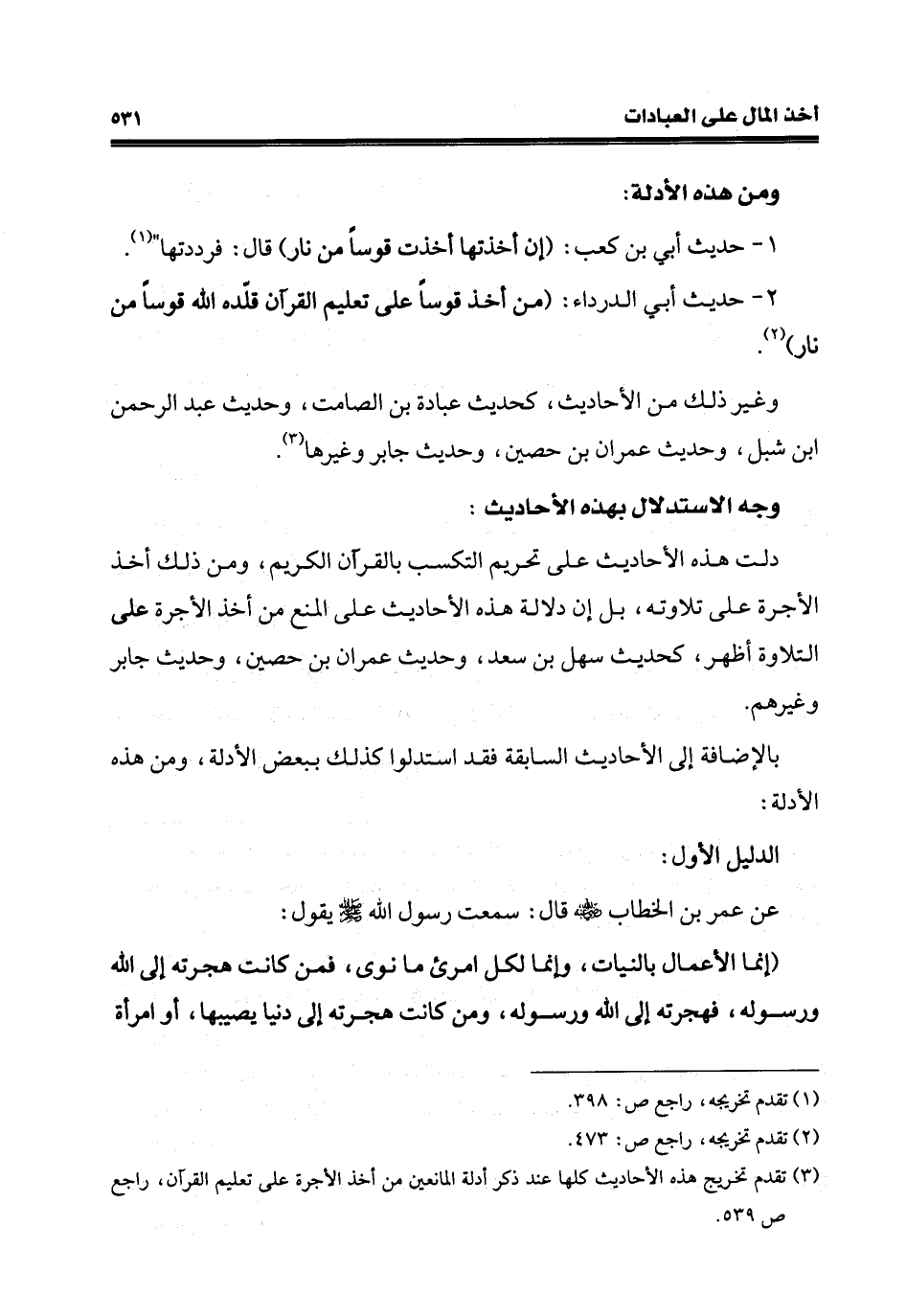 (¬3) تقدّم تخريج هذه الأحاديث كلها عند ذكر أدلة المانعين من أخذ الأجرة على تعليم القرآن، راجع ص 539.