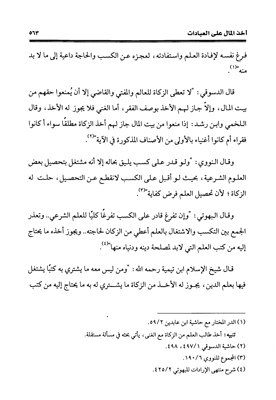 وقال البهوتي: "وإن تفرغ قادر على الكسب تفرغًا كليًا للعلّم الشرعي .. وتعذر الجمع بين التكسب والاشتغال بالعلّم أعطي من الزَّكاة لحاجته .. ويجوز أخذه ما يحتاج إليه من كتب العلم الّتي لا بد لمصلحة دينه ودنياه منها" (¬4).