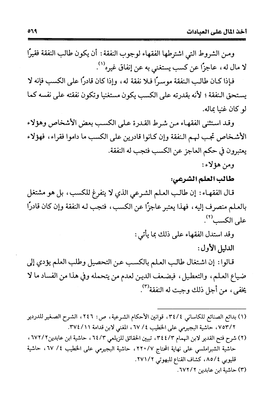 قالوا: إنَّ اشتغال طالب العلم بالكسب عن التحصيل وطلب العلم يؤدِّي إلى ضياع العلم، والتعطيل، فيضعف الدِّين لعدم من يتحمله وفي هذا من الفساد ما لا يخفى، من أجل ذلك وجبت له النفقة (¬3).