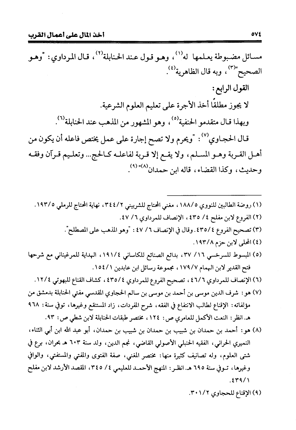 قال الحجاوي (¬7): "ويحرم ولا تصح إجارة على عمل يختص فاعله أن يكون من أهل القربة وهو المسلم، ولا يقع إِلَّا قربة لفاعله كالحج ... وتعليم قرآن وفقه وحديث، وكذا القضاء، قاله ابن حمدان (¬8) " (¬9).