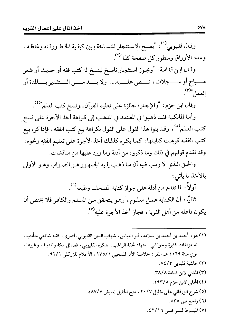 ثانيًا: أن الكتابة عمل معلوم، وهو يتحقق من المسلم والكافر فلا يختص أن يكون فاعله من أهل القربة، فجاز أخذ الأجرة عليه (¬7).