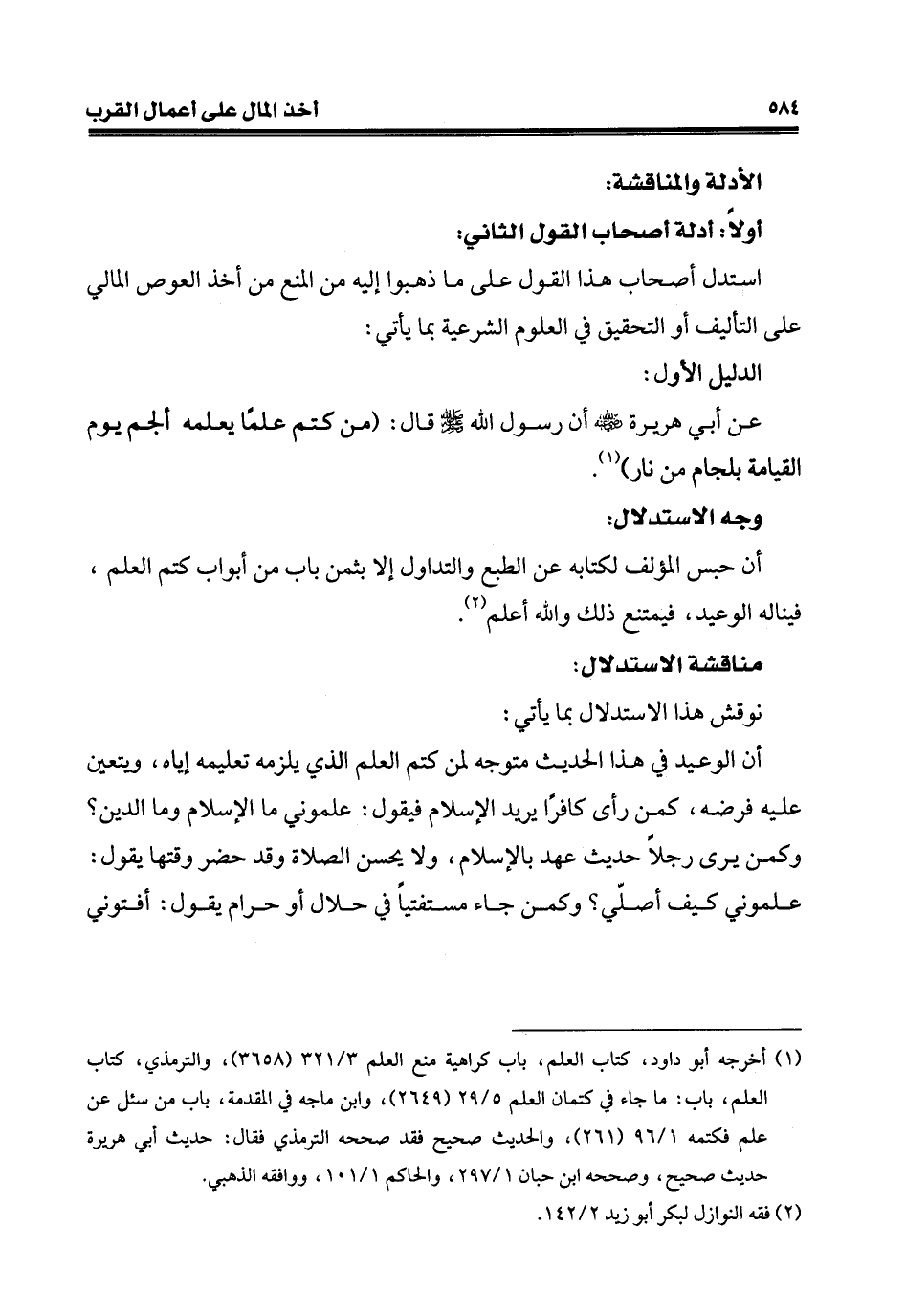 أن حبس المؤلِّف لكتابه عن الطبع والتداول إِلَّا بثمن باب من أبواب كتم العلم، فيناله الوعيد، فيمتنع ذلك والله أعلم (¬2).