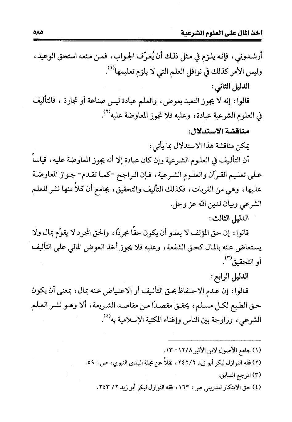 قالوا: إنّه لا يجوز التعبد بعوض، والعلّم عبادة ليس صناعة أو تجارة، فالتأليف في العلوم الشرعية عبادة، وعليه فلا تجوز المعاوضة عليه (¬2).