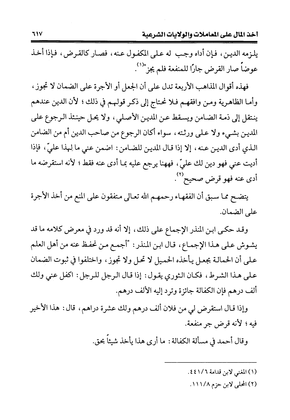 فهذه أقوال المذاهب الأربعة تدل على أن الجعل أو الأجرة على الضمان لا تجوز، وأمّا الظاهرية ومن وافقهم فلا نحتاج إلى ذكر قولهم في ذلك؛ لأنَّ الدِّين عندهم ينتقل إلى ذمة الضامن ويسقط عن المدين الأصلّي، ولا يحل حينئذ الرجوع على المدين بشيء ولا على ورثته، سواء أكان الرجوع من صاحب الدِّين أم من الضامن الّذي أدى الدِّين عنه، إِلَّا إذا قال المدين للضامن: اضمن عني ما لهذا عليّ، فإذا أديت عني فهو دين لك عليّ، فههنا يرجع عليه بما أدى عنه فقط؛ لأنّه استقرضه ما أدى عنه فهو قرض صحيح (¬2).