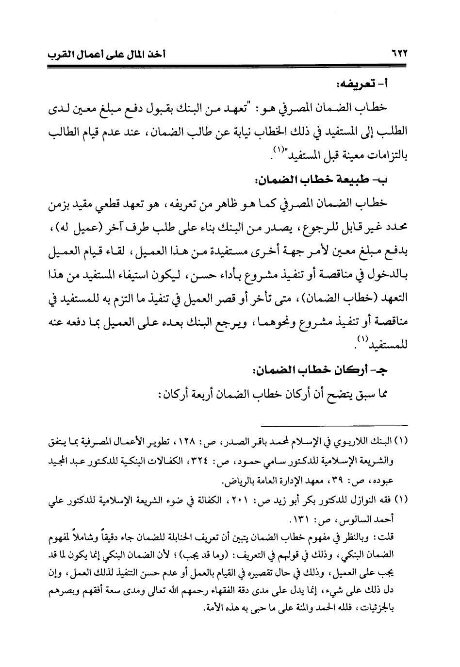 (¬1) البنك اللاربوي في الإسلام لمحمد باقر الصدر، ص: 128، تطوير الأعمال المصرفية بما يتفق والشريعة الإِسلامية للدكتور سامي حمود، ص: 324، الكفالات البنكية للدكتور عبد المجيد عبوده، ص: 39، معهد الإدارة العامة بالرياض.