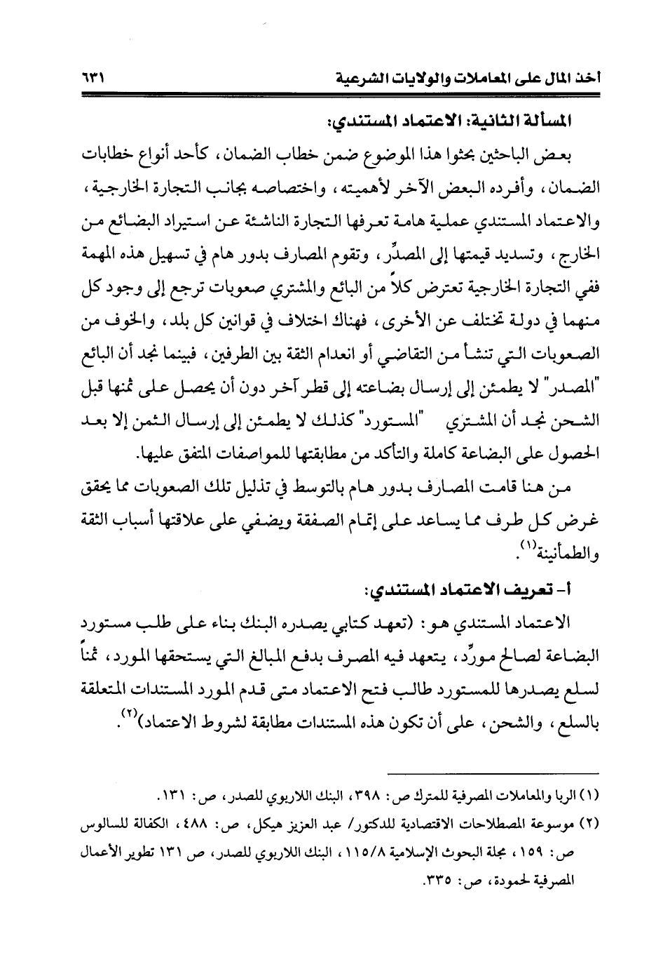 (¬2) موسوعة المصطلاحات الاقتصادية للدكتور/ عبد العزيز هيكل، ص: 488، الكفالة للسالوس ص: 159، مجلة البحوث الإِسلامية 8/ 115، البنك اللاربوي للصدر، ص 131 تطوير الأعمال المصرفية لحمودة، ص: 335.