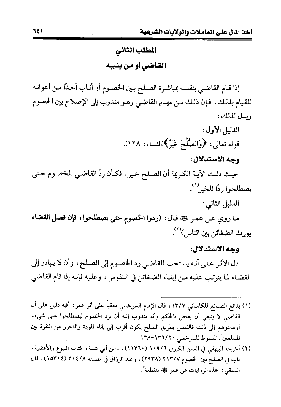(¬1) بدائع الصنائع للكاساني 7/ 13، قال الإمام السرخسي معقبًا على أثر عمر: "فيه دليل على أن القاضي لا ينبغى أن يعجل بالحكم وأنّه مندوب إليه أن يردّ الخصوم ليصطلحوا على شيء، أو يدعوهم إلى ذلك فالفصل بطريق الصلح يكون أقرب إلى بقاء المودة والتحرز من النفرة بين المسلمين". المبسوط للسرخسي 20/ 136 - 138.