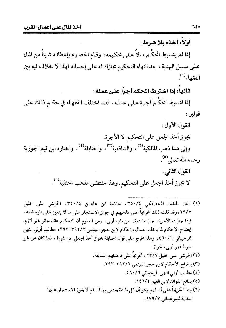 (¬1) الدر المختار للحصفكي 4/ 350، حاشية ابن عابدين 4/ 350، الخرشي على خليل 7/ 23، وقد قلت ذلك تخريجًا على مذهبهم في جواز الاستئجار على ما لا يتعين على المرء فعله، فإذا جازت الأجرة، جاز ما دونها من باب أولى، ومن المعلوم أن التحكيم عقد جائز غير لازم.